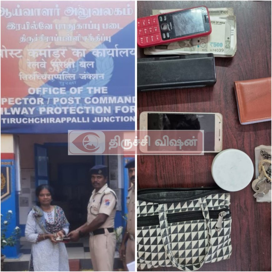 இன்று 06.04.2025 திருச்சிராப்பள்ளி ரயில் நிலையத்தில் வைகை வண்டியில் பயணி ரமேஷ் என்பவர் திருச்சியிலிருந்து அரியலூர் வரை செல்லும் போது தனது பையை PF எண். 03 இல் விட்டுச் சென்றதாகத் தெரிவித்தார். அதன்பேரில் திருச்சி ரயில்வே பாதுகாப்பு படையினர் விரைந்து செயல்பட்டு மேற்படி பையை உரிமையாளரிடம் ஒப்படைத்தனர்.