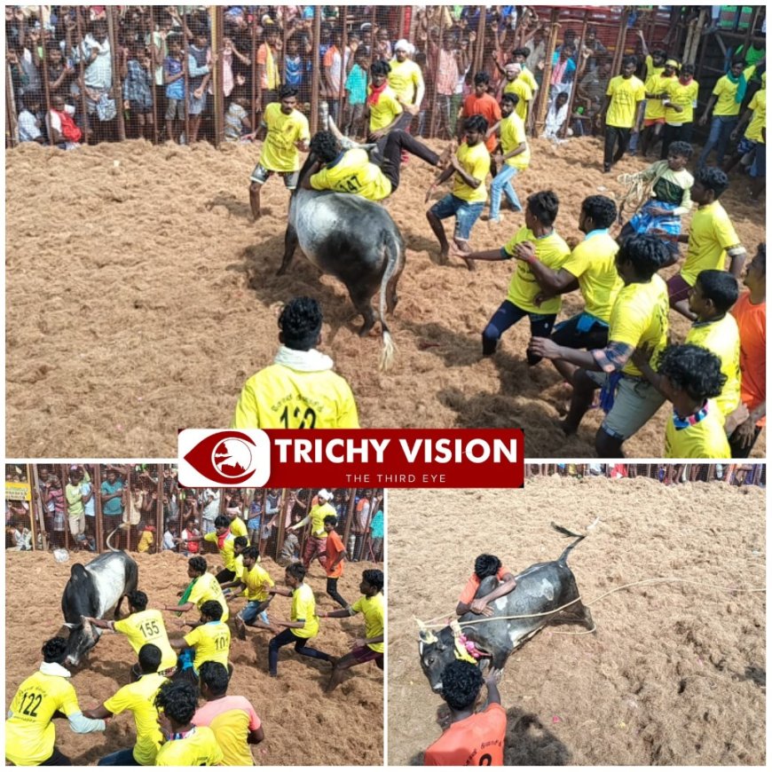 திருச்சி மாவட்டம்மணப்பாறை அடுத்த துவரங்குறிச்சி அருகே உள்ள பழைய பாளையத்தில் ஸ்ரீ வரதராஜ பெருமாள் கோவில் திருவிழாவை முன்னிட்டு ஆலய திடலில் ஜல்லிருச்சி மாவட்டம் மணப்பாறை அடுத்த பழைய பாளையத்தில் ஸ்ரீ வரதராஜ பெருமாள் மற்றும் பட்டத்தளச்சி அம்மன் கோவில் சித்ரா பௌர்ணமி திருவிழாவை முன்னிட்டு ஜல்லிக்கட்டு போட்டி இன்று காலை ஆலயம் வளாகத்தில் தொடங்கியது.
