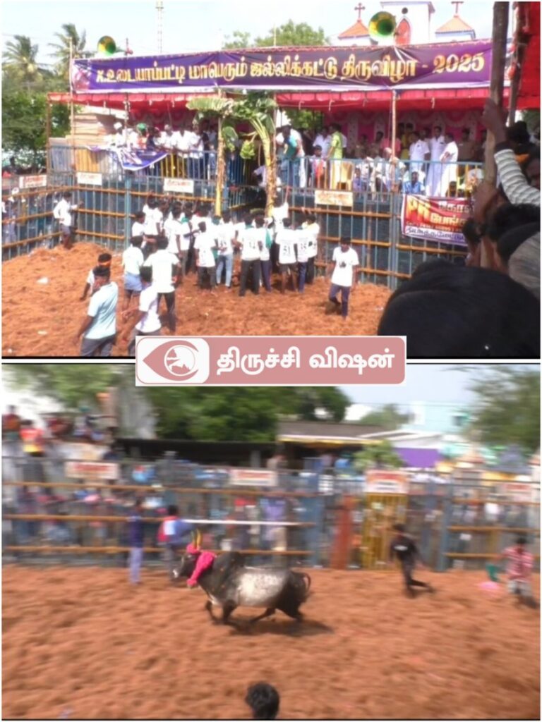 மணப்பாறை அருகே கே.உடையாபட்டியில் ஜல்லிக்கட்டு விழா.வாடிவாசலில் சீறிப்பாய்ந்துவரும் காளைகள்.வீரத்துடன் காளைகளை எதிர்கொள்ளும் மாடுபிடி வீரர்கள்.திருச்சி மாவட்டம், மணப்பாறை அருகே உள்ள கே.உடையாபட்டியில் தூய பனிமாதா ஆலயம் முன்பு உள்ள திடலில்