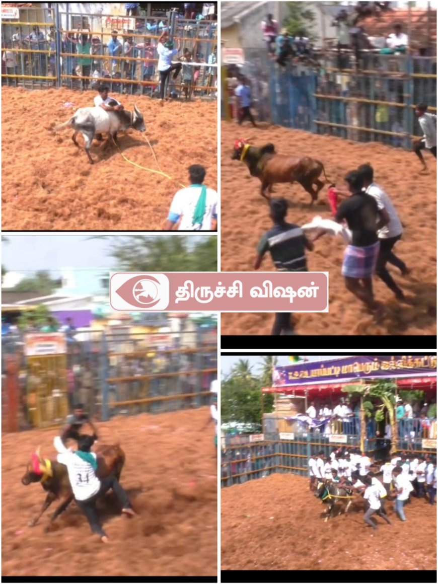 வாடிவாசல் அமைக்கப்பட்டு ஜல்லிக்கட்டு போட்டி நடைபெற்று வருகிறது. இந்த ஜல்லிக்கட்டு விழாவில் திருச்சி, திண்டுக்கல், மதுரை, சிவகங்கை, புதுக்கோட்டை, தேனி, கரூர் உள்ளிட்ட பல்வேறு மாவட்டங்களில் இருந்து கொண்டு வரப்பட்டிருந்த 700 ஜல்லிக்கட்டு காளைகள் வாடிவாசல் வழியாக அவிழ்த்து விடப்பட்டு வருகின்றன. சீறிப்பாய்ந்து வரும் காளைகளை தீரத்துடன் அடக்க 300 மாடுபிடி வீரர்கள் ஒவ்வொரு சுற்று