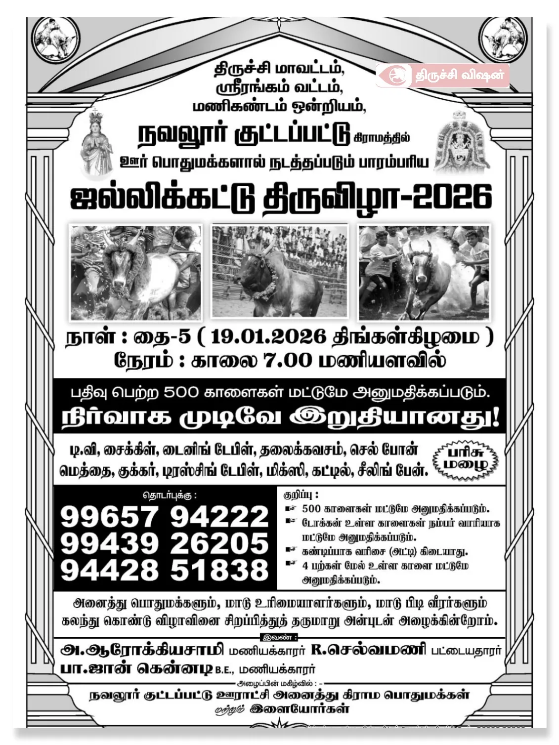 திருச்சி மாவட்டம், ஸ்ரீரங்கம் வட்டம், மணிகண்டம் ஒன்றியம், நவலூர் குட்டப்பட்டு கிராமத்தில் பாரம்பரியமான ஜல்லிக்கட்டு திருவிழா – 2026 மிகுந்த உற்சாகத்துடன் நடைபெற உள்ளது.