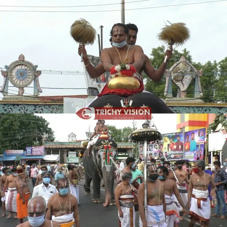 மிகவும் விஷேசமான ஜேஷ்டாபிஷேகத்தின் போது இன்று காலை கருடமண்டபத்திலிருந்து தங்ககுடம் எடுத்து வந்து, அம்மாமண்டபம் புனித திருக்காவிரியிலிருந்து கோவில் யானை ஆண்டாள் மீது திருமஞ்சனம் (புனிதநீர்) வைக்கப்பட்டு கோவில் அர்ச்சகர்களால் முக கவசம் அணிந்து சமூக இடைவெளியுடன் 4 பேர் ஊர்வலமாக கோவிலுக்கு கொண்டு வரப்பட்டது.
