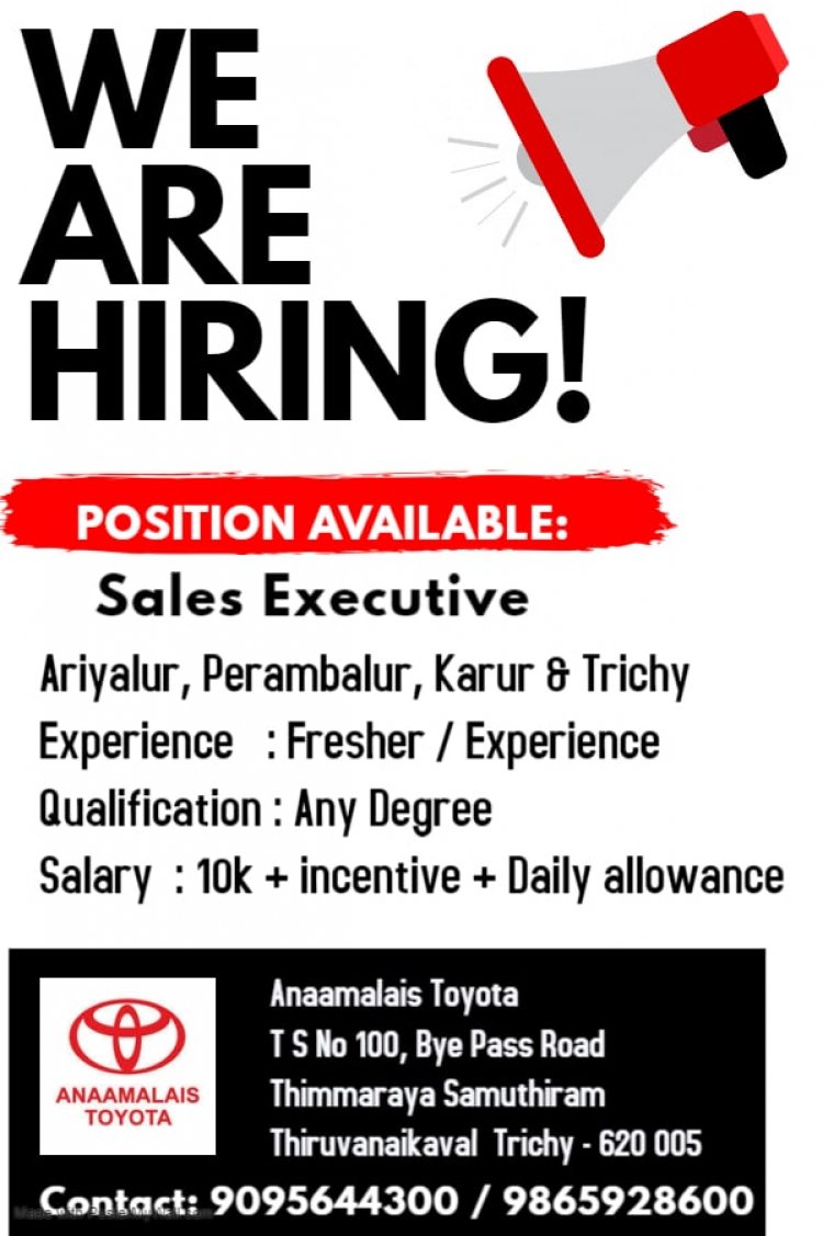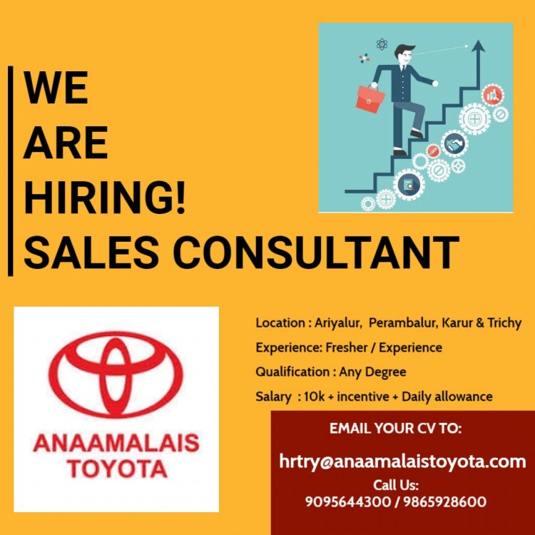 Anaamalais Toyota கார் நிறுவனத்தில் பணியாற்ற விற்பனைப் பிரதிநிதிகள் தேவை .அரியலூர் பெரம்பலூர் ,கரூர் மற்றும் திருச்சி நிறுவனங்களில் முன் அனுபவம் உள்ளவர்கள் புதிய நபர்கள் விற்பனைப் பிரதிநிதிகள் பணிக்கு விண்ணப்பிக்கலாம். பட்டப்படிப்பு முடித்தவர்கள் மேற்கண்ட முகவரிக்கு நேரில் வரவும்.