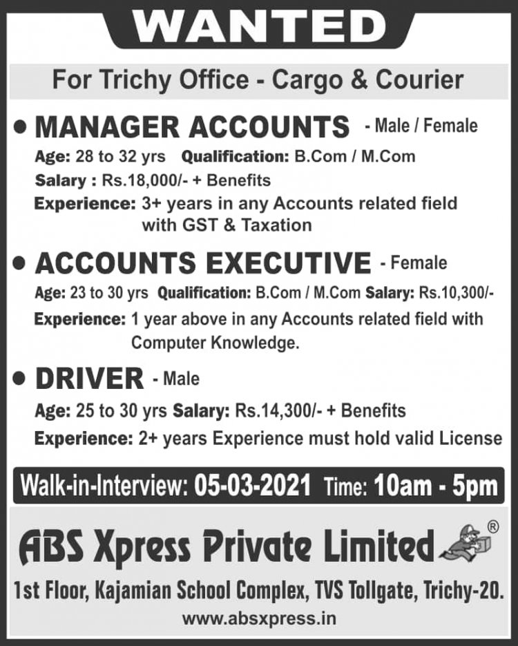 திருச்சி டிவிஎஸ் டோல்கேட் பகுதியில் இயங்கி வரும் ஏபிஎஸ் எக்ஸ்பிரஸ் பிரைவேட் லிமிடெட்டில் பணிபுரிய அக்கவுண்ட்ஸ் பிரிவில் மேலாளர், அக்கவுண்ட்ஸ் பிரதிநிதி மற்றும் ஓட்டுனர்கள் வேலைக்கு ஆட்கள் தேவை. விண்ணப்பதாரர்கள் தங்களது சான்றிதழுடன் (05.03.2021 )ஐந்தாம் தேதி காலை 10 மணி முதல் 5 மணி வரை நேரில் வர வரவேற்கப்படுகிறார்கள்.