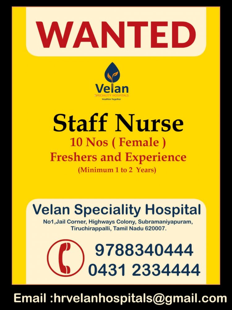 திருச்சி சுப்பிரமணியபுரத்தில் உள்ள வேலன் மருத்துவமனையில் பணிபுரிய 10 செவிலியர்கள் தேவை. குறைந்த பட்சம் ஒரு வருடம் அல்லது 2 வருடம் அனுபவமுள்ள மற்றும் பயிற்சி படிப்பு முடித்தவர்கள் கீழ்கண்ட இமெயில் முகவரியில் தங்களை சுய விபரத்தை அனுப்பவும். மேலும் தகவல்களைப் பெற தொலைபேசி எண்ணில் தொடர்பு கொள்ளலாம்.