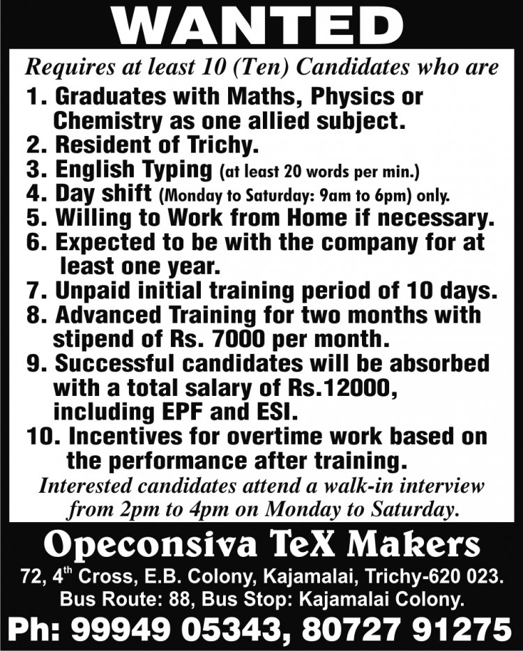 திருச்சி காஜாமலை காலனி பகுதியில் Opeconsiva Tex Makers என்கிற BPO கம்பனி இயங்கி வருகிறது. தற்போது அந்நிறுவனத்தின் வேலை வாய்ப்புக்கான அறிவிப்பு வெளியாகியுள்ளது.