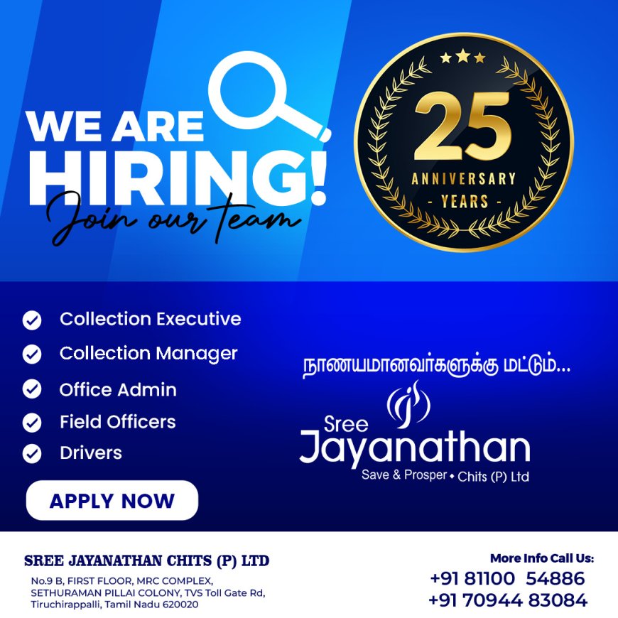 திருச்சியில் செயல்பட்டு வரும் ஸ்ரீ ஜெயநாதன் சிட்ஸ் பிரைவேட் லிமிடெட் நிறுவனத்திற்கு பல்வேறு பணியிடங்களுக்கு வேலை வாய்ப்புகள் அறிவிக்கப்பட்டுள்ளது.