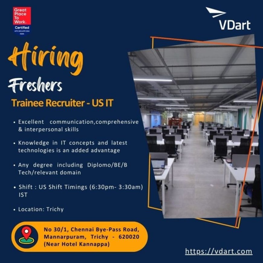 திருச்சியில் செயல்பட்டு வரும் பிரபல VDart நிறுவனத்தில் கீழ்கண்ட பணியிடங்களுக்கு வேலை வாய்ப்புகள் அறிவிக்கப்பட்டுள்ளன. மேலும் விவரம் மற்றும் தொடர்புக்கு கீழே உள்ள படத்தை பார்க்கவும்.