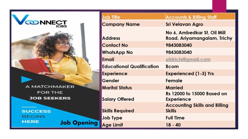 திருச்சியில் செயல்பட்டு வரும் ஸ்ரீ வேலவன் அக்ரோ நிறுவனத்தியற்கு கீழ்க்கண்ட பணியிடத்திற்கு வேலை வாய்ப்புகள் அறிவிக்கப்பட்டுள்ள.