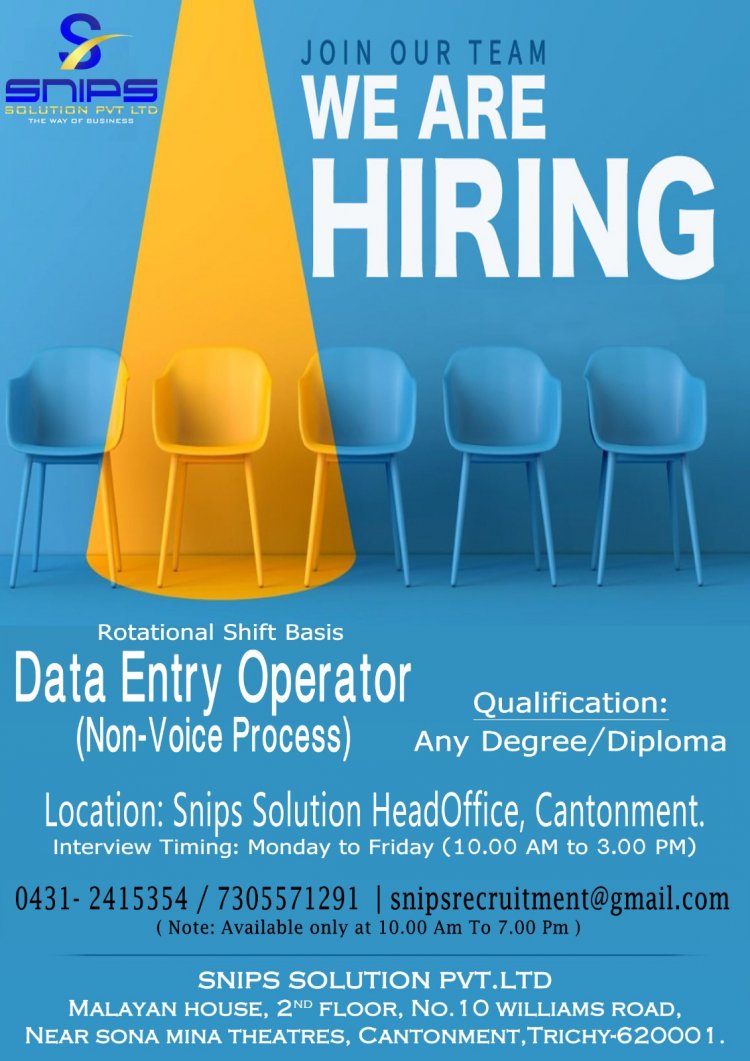 திருச்சியில் செயல்பட்டு வரும் Snips Solution Pvt Ltd நிறுவனத்தில் கீழ்கண்ட பணியிடங்களுக்கு வேலை வாய்ப்புகள் அறிவிக்கப்பட்டுள்ளன.