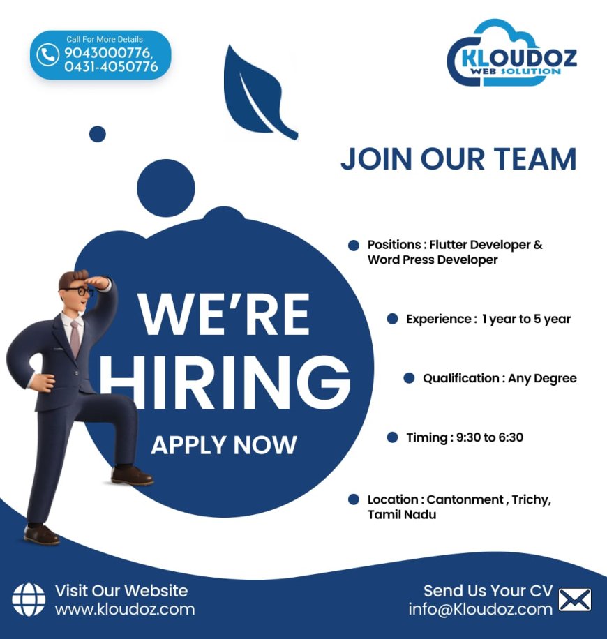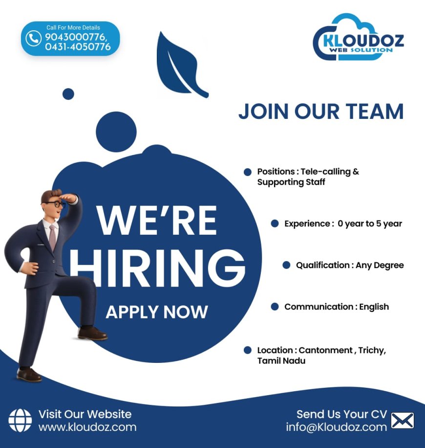 திருச்சி KLOUDOZ Wob Solution நிறுவனத்தில் கீழ்கண்ட பணியிடங்களுக்கு வேலை வாய்ப்புகள் அறிவிக்கப்பட்டுள்ளன.