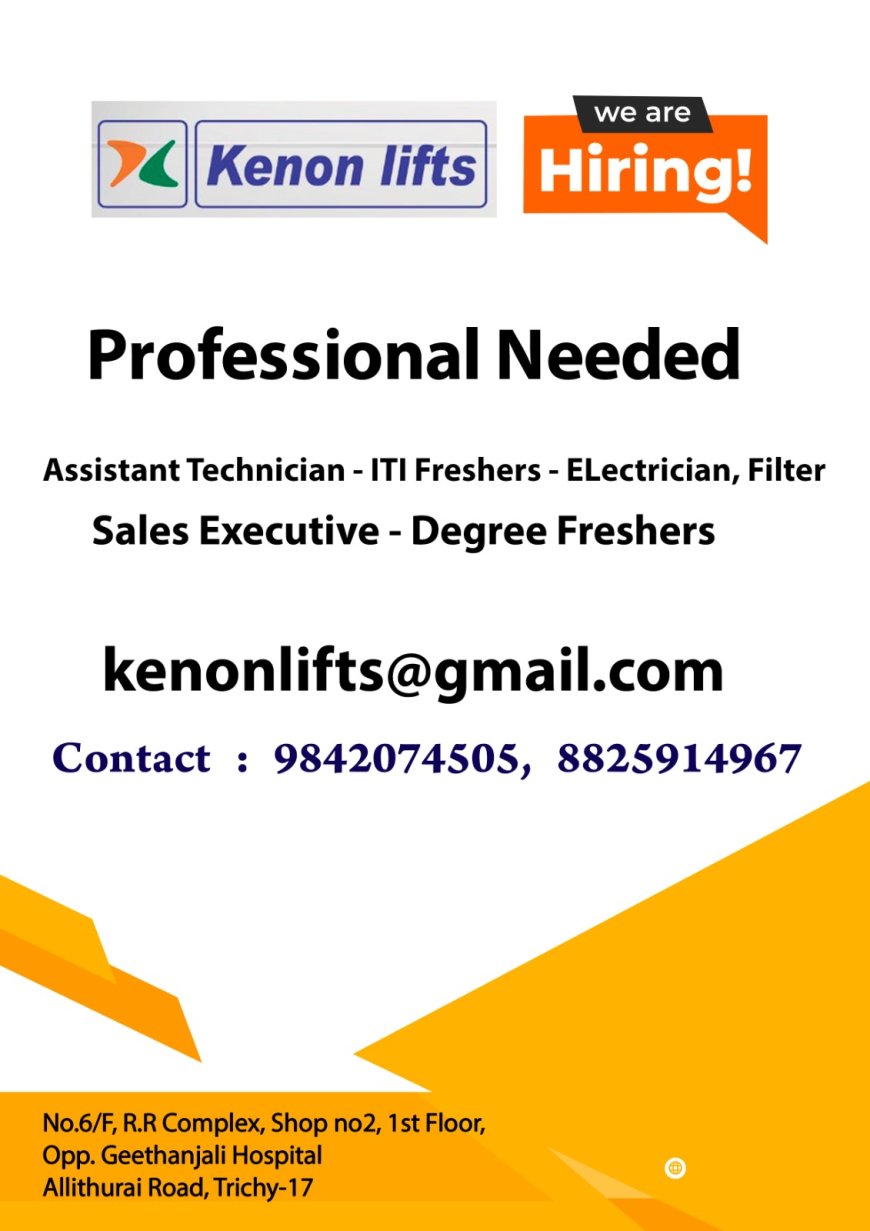 திருச்சியில் செயல்பட்டு வரும் Kenon Lifts நிறுவனத்தில் பல்வேறு பணியிடங்களுக்கு வேலை வாய்ப்புகள் அறிவிக்கப்பட்டுள்ளன.மேலும் விவரம் மற்றும் தொடர்புக்கு கீழ உள்ள படத்தை பார்க்கவும்.