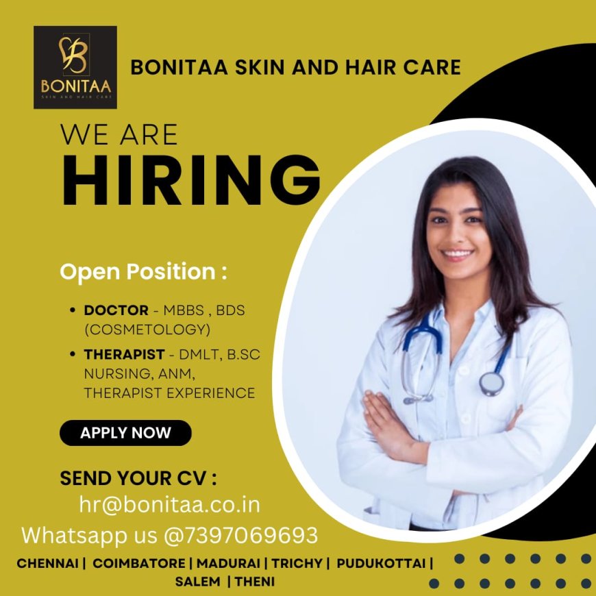 தமிழ்நாட்டில் பல்வேறு மாவட்டங்களில் செயல்பட்டு வரும் பிரபல BONITAA SKIN AND HAIR CARE -ல் கீழ்க்கண்ட பணியிடங்களுக்கு வேலை வாய்ப்புகள் அறிவிக்கப்பட்டுள்ளது. மேலும் விபரங்கள் மற்றும் தொடர்புக்கு கீழே உள்ள படத்தை பார்க்கவும்.