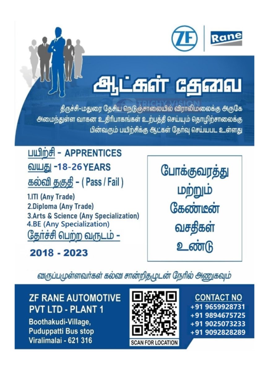 திருச்சி – மதுரை தேசிய நெடுஞ்சாலை விராலிமலைக்கு அருகே அமைந்துள்ள வாகன உதிரி பாகங்கள் உற்பத்தி செய்யும் தொழிற்சாலைக்கு கீழ்கண்ட பணியிடங்களுக்கு ஆட்கள் தேர்வு செய்யப்பட்டுள்ளனர்.