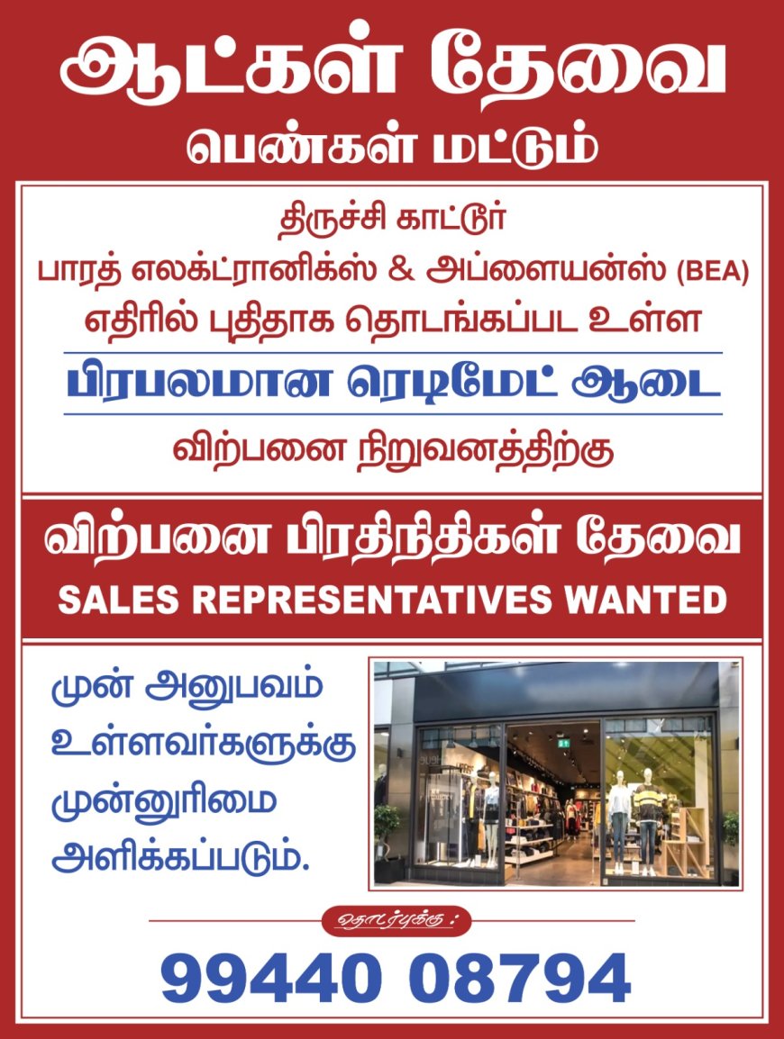 திருச்சி காட்டூரில் புதிதாக தொடங்கப்பட உள்ள ரெடிமேடு ஆடை விற்பனை நிறுவனத்திற்கு கீழ்கண்ட பணியிடத்திற்கு வேலைவாய்ப்புகள் அறிவிக்கப்பட்டுள்ளன மேலும் விவரம் மற்றும் தொடர்புக்கு கீழே உள்ள படத்தை பார்க்கவும்.