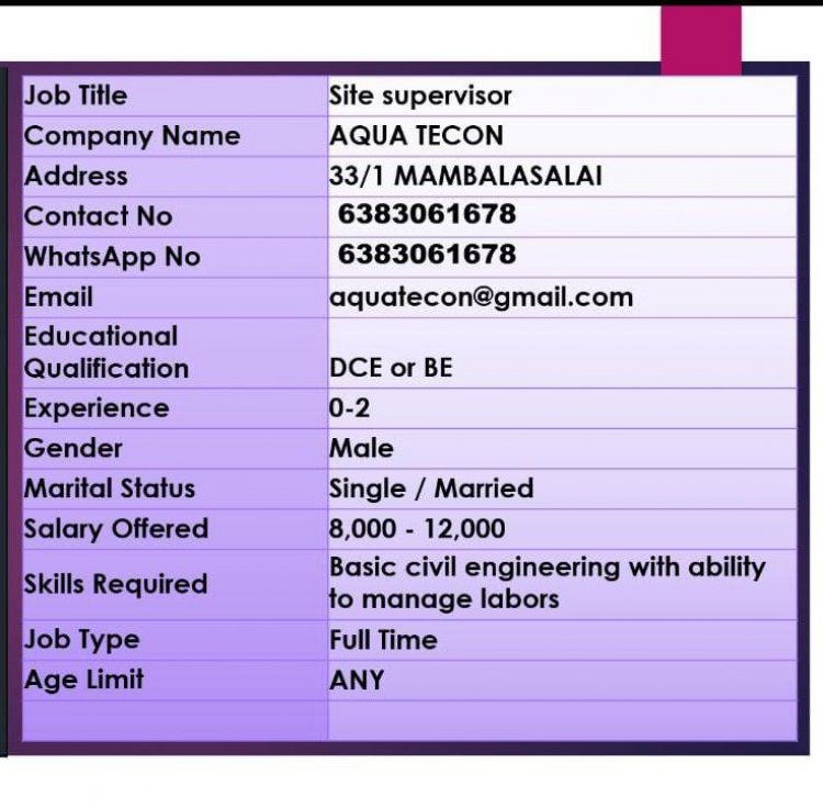 Aqua Tecon நிறுவனத்தில் வேலைவாய்ப்புகள் அறிவிக்கப்பட்டுள்ளன மேலும் விவரங்களுக்கு கீழ் உள்ள படத்தை காணவும்.
