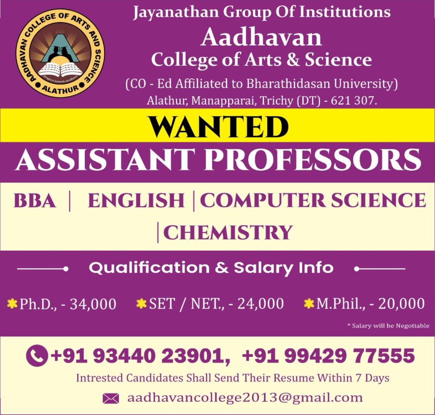 திருச்சி மணப்பாறை ஆதவன் கலை மற்றும் அறிவியல் கல்லூரியில் கீழ்கண்ட பணியிடங்களுக்கு வேலைவாய்ப்புகள் அறிவிக்கப்பட்டுள்ளன. மேலும் தொடர்பு மற்றும் விபரங்களுக்கு கீழே உள்ள படத்தை பார்க்கவும்.