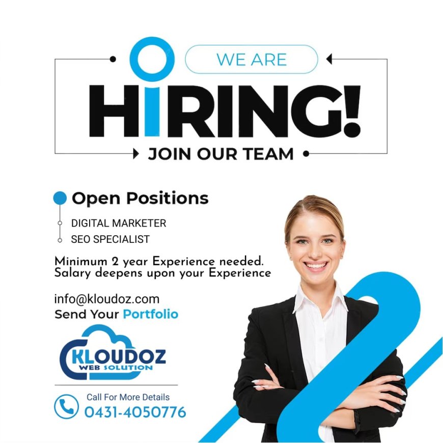 திருச்சியில் செயல்பட்டு வரும் பிரபல KLOUDOZ WEB SOLUTION நிறுவனத்தில் கீழ்க்கண்ட பணியிடங்களுக்கு வேலை வாய்ப்புகள் அறிவிக்கப்பட்டு உள்ளன. மேலும் மேலும் விபரம் மற்றும் தொடர்புக்கு கீழே உள்ள படத்தைப் பார்க்கவும்.