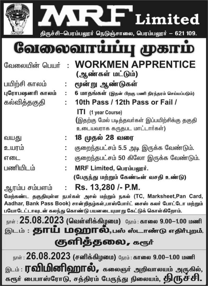 எம்ஆர்எப் நிறுவனத்தில் வேலை வாய்ப்புகள் அறிவிக்கப்பட்டுள்ளன. மேலும் விவரங்களுக்கு கீழ் உள்ள படத்தை காணவும்.