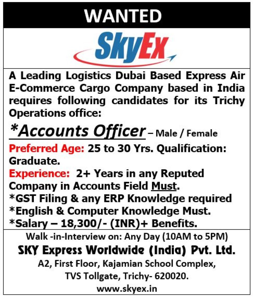 திருச்சி ஸ்கை எக்ஸ் நிறுவனத்தில் வேலை வாய்ப்புகள் அறிவிக்கப்பட்டுள்ளன மேலும் விவரங்களுக்கு கீழே உள்ள படத்தை காணவும்