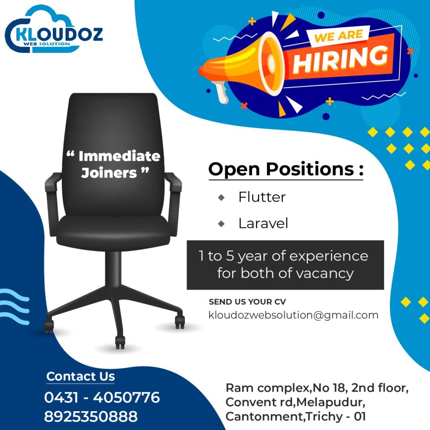 திருச்சியில் செயல்பட்டு வரும் KLOUDOZ நிறுவனத்தில் பல்வேறு பணியிடகளுக்கு வேலைவாய்ப்புகள் அறிவிக்கப்பட்டுள்ளன. மேலும் விவரம் மற்றும் தொடர்புக்கு கீழே உள்ள படத்தை பார்க்கவும்.