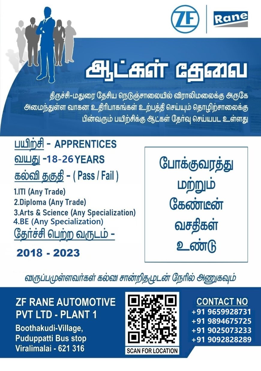 திருச்சி – மதுரை தேசிய நெடுஞ்சாலை விராலிமலை அருகே அமைந்துள்ள வாகன உதிரிபாகங்கள் உற்பத்தி செய்யும் தொழிற்சாலைக்கு பின்வரும் பயிற்சிகளுக்கு ஆட்கள் தேர்வு செய்யப்பட உள்ளனர்.