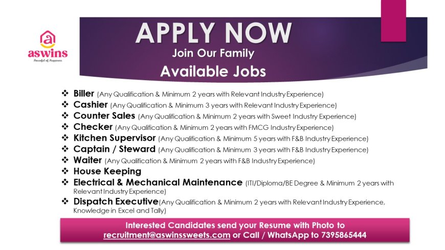 திருச்சி அஸ்வின் உணவகத்தில் பணிபுரிய வேலைவாய்ப்புகள் அறிவிக்கப்பட்டுள்ளன மேலும் விவரங்களுக்கு கீழே உள்ள படத்தை காணவும்.