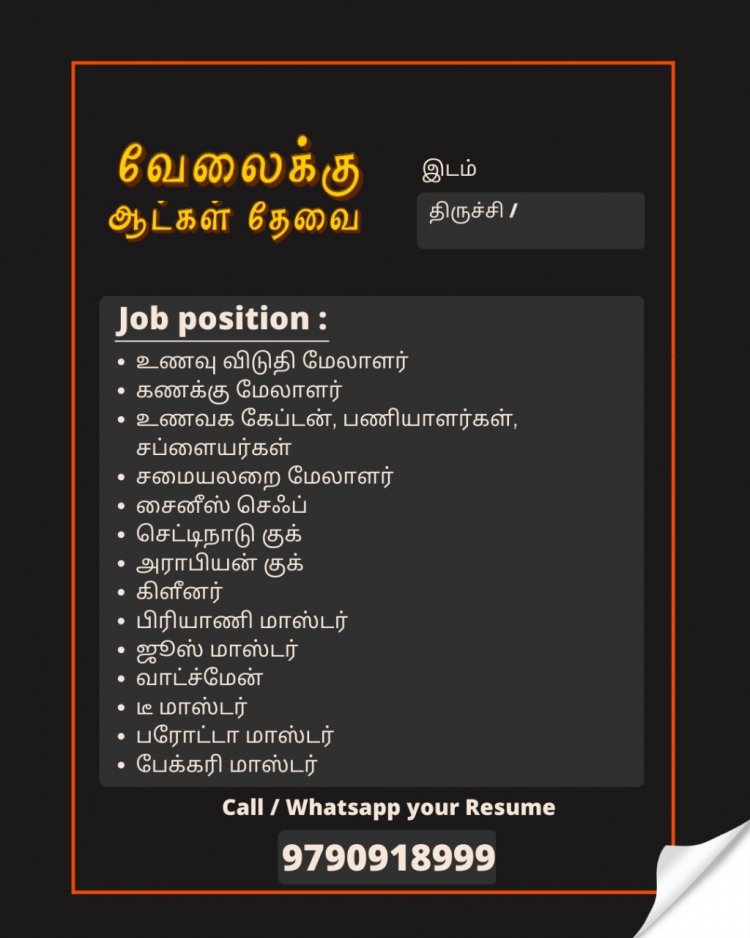 திருச்சியில் உணவு விடுதியில் வேலை வாய்ப்புகள் அறிவிக்கப்பட்டுள்ளன மேலும் விவரங்களுக்கு கீழ் உள்ள படத்தை காணவும்