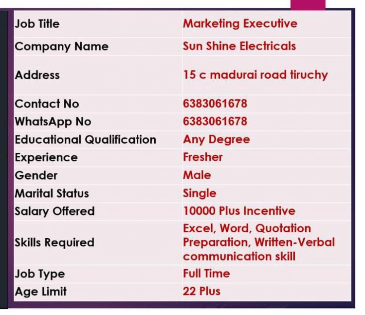 திருச்சி Sun shine Electricals நிறுவனத்தில் வேலை வாய்ப்புகள் அறிவிக்கப்பட்டுள்ளன. மேலும் விவரங்களுக்கு கீழ் உள்ள படத்தை பார்க்கவும்.