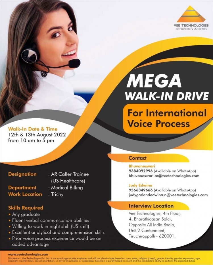 திருச்சியில் செயல்பட்டு வரும் VEE Technologies நிறுவனத்தில் பல்வேறு பணியிடங்களுக்கு வேலைவாய்ப்புகள் அறிவிக்கப்பட்டுள்ளன. மேலும் விவரங்களுக்கு கீழே உள்ள படத்தை பார்க்கவும்.