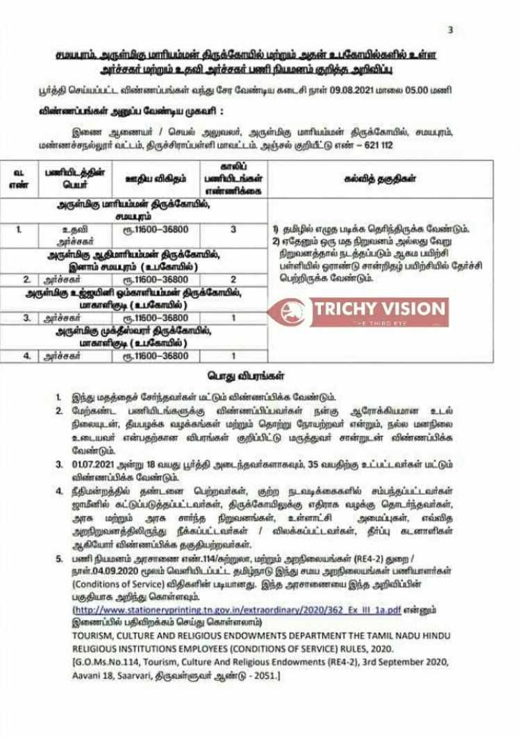 திருச்சி சமயபுரம் மாரியம்மன் கோவிலில் பல்வேறு பணியிடங்களுக்கு வேலை வாய்ப்புகள் அறிவிக்கப்பட்டுள்ளன. மேலும் விபரங்களுக்கு கீழே உள்ள படத்தை பார்க்கவும்.