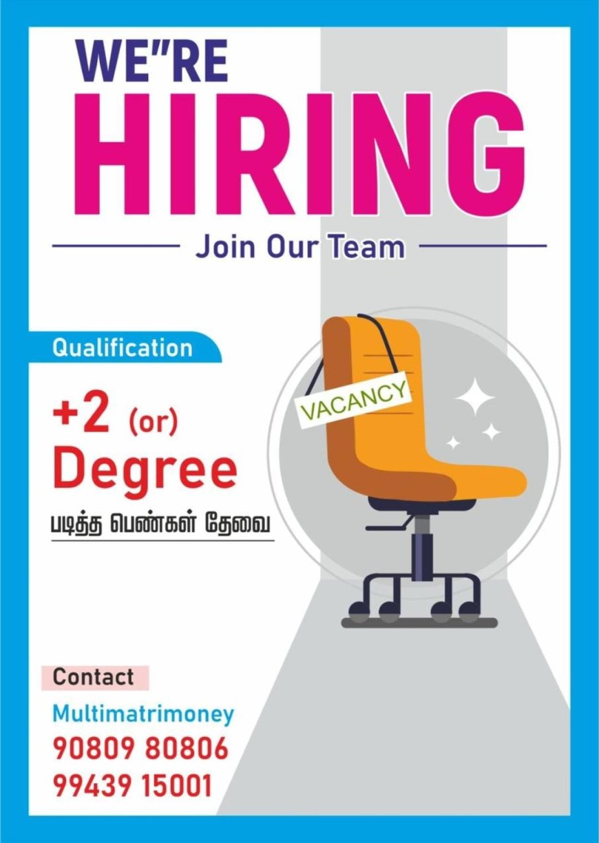திருச்சியில் செயல்பட்டு வரும் மல்டிமேட்ரிமோனி நிறுவனத்திற்கு பிளஸ் டூ மற்றும் டிகிரி படித்த பெண்களுக்கு வேலை வாய்ப்புகள் அறிவிக்கப்பட்டுள்ளன.