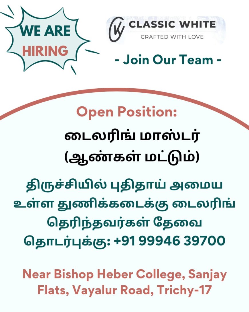 திருச்சியில் புதிதாக தொடங்கப்பட உள்ள துணி கடைக்கு டைலரிங் தெரிந்த ஆட்கள் தேவை மேலும் விவரங்களுக்கு கீழே உள்ள படத்தை காணவும்