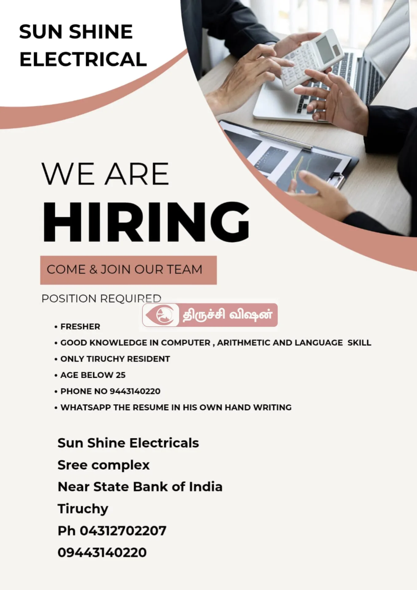 திருச்சி சன் ஷைன் எலக்ட்ரிக்கல் நிறுவனம் தற்போது புதிய பணியாளர்களைத் தேடி வருகிறது. இந்தப் பணிக்கு விண்ணப்பிக்கும் விண்ணப்பதாரர்கள் முன் அனுபவம் இல்லாதவர்களாகவும் (Fresher), கணினி அறிவு, கணிதத் திறன் மற்றும் மொழித் திறன் கொண்டவர்களாகவும் இருக்க வேண்டும். மேலும்,