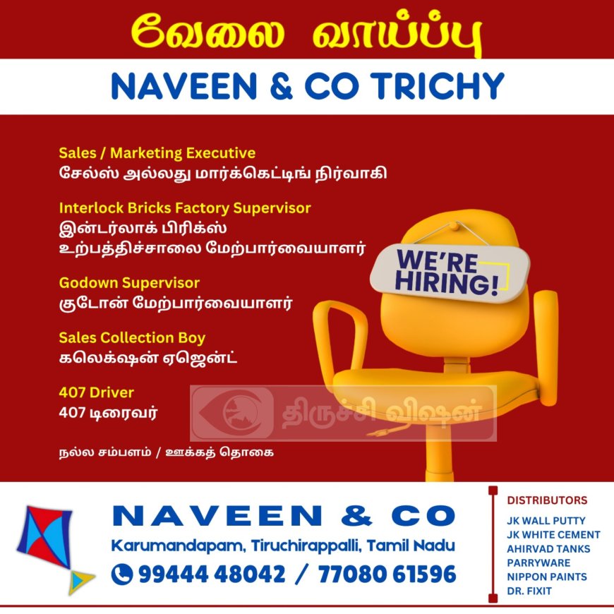 திருச்சியில் இயங்கி வரும் “NAVEEN&CO TRICHY” நிறுவனத்திற்கு கீழ்க்கண்ட பணிகளுக்கு ஆட்கள் தேவை.