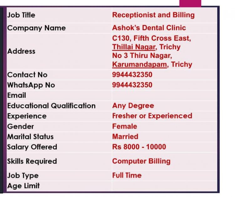 திருச்சியில் செயல்பட்டு வரும் அசோக்ஸ் பல் மருத்துவமனையில் கீழ்கண்ட பணியிடங்களுக்கு வேலைவாய்ப்பு அறிவிக்கப்பட்டுள்ளது.