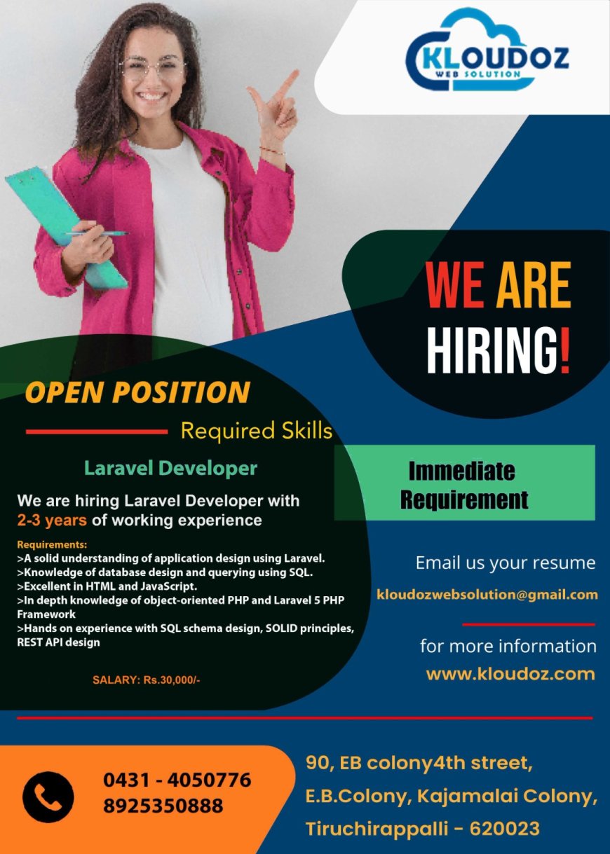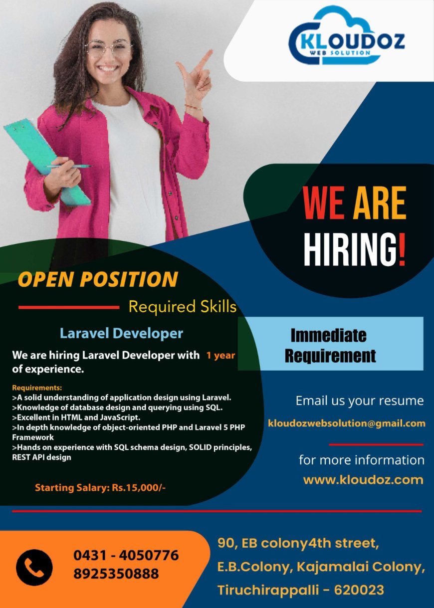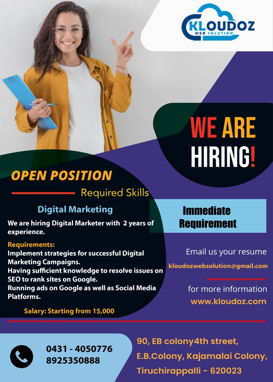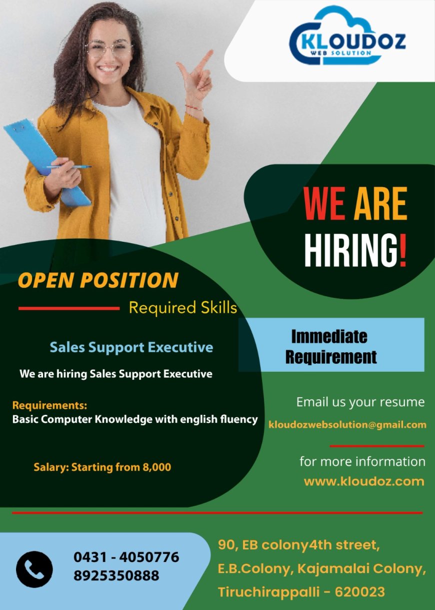 திருச்சி kloudoz வெப்சொல்யூஷன் நிறுவனத்தில் பல்வேறு பணிகளுக்கான வேலை வாய்ப்புகள் அறிவிக்கப்பட்டன. மேலும் விவரங்களுக்கு கீழ் உள்ள படங்களை காணவும்.