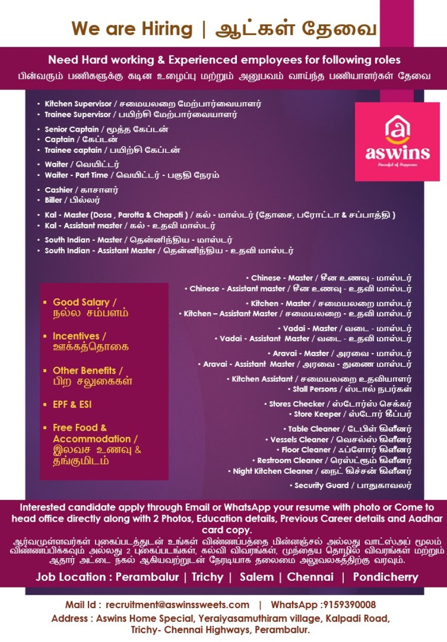 திருச்சி அஸ்வின் உணவகத்தில் பணிபுரிய வேலைவாய்ப்புகள் அறிவிக்கப்பட்டுள்ளன மேலும் விவரங்களுக்கு கீழே உள்ள படத்தை காணவும்.