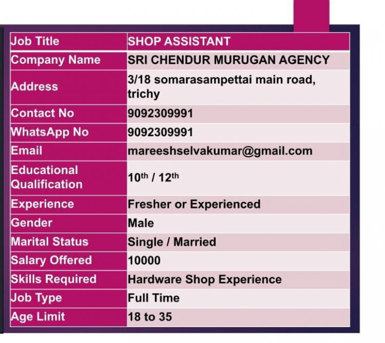திருச்சியில் செயல்பட்டு வரும் ஸ்ரீ செந்தூர் முருகன் ஏஜென்சி நிறுவனத்தில் கீழ்க்கண்ட பணியிடத்திற்கு வேலை வாய்ப்பு அறிவிக்கப்பட்டுள்ளது.