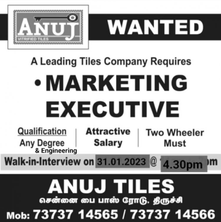 திருச்சியில் செயல்பட்டு வரும் அனுஜ் டைல்ஸ் நிறுவனத்தில் கீழ்க்கண்ட பணியிடங்களுக்கு வேலை வாய்ப்பு அறிவிக்கப்பட்டுள்ளது. இதில் பொறியியல் மற்றும் கலை அறிவியல் பட்டப்படிப்பு முடித்தவர்கள் விண்ணப்பிக்கலாம்.