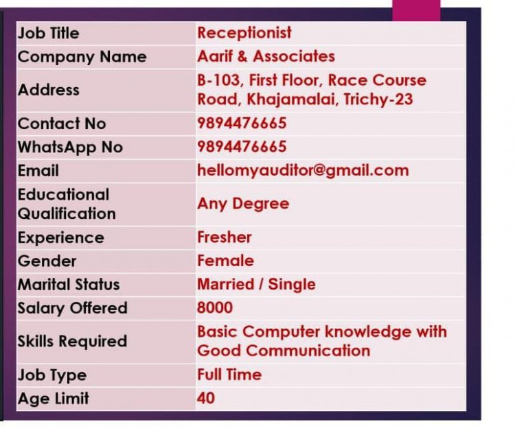 திருச்சியில் செயல்பட்டு வரும் Asrif & Associates நிறுவனத்தில் கீழ்கண்ட பணியிடங்களுக்கு வேலை வாய்ப்பு அறிவிக்கப்பட்டுள்ளது.