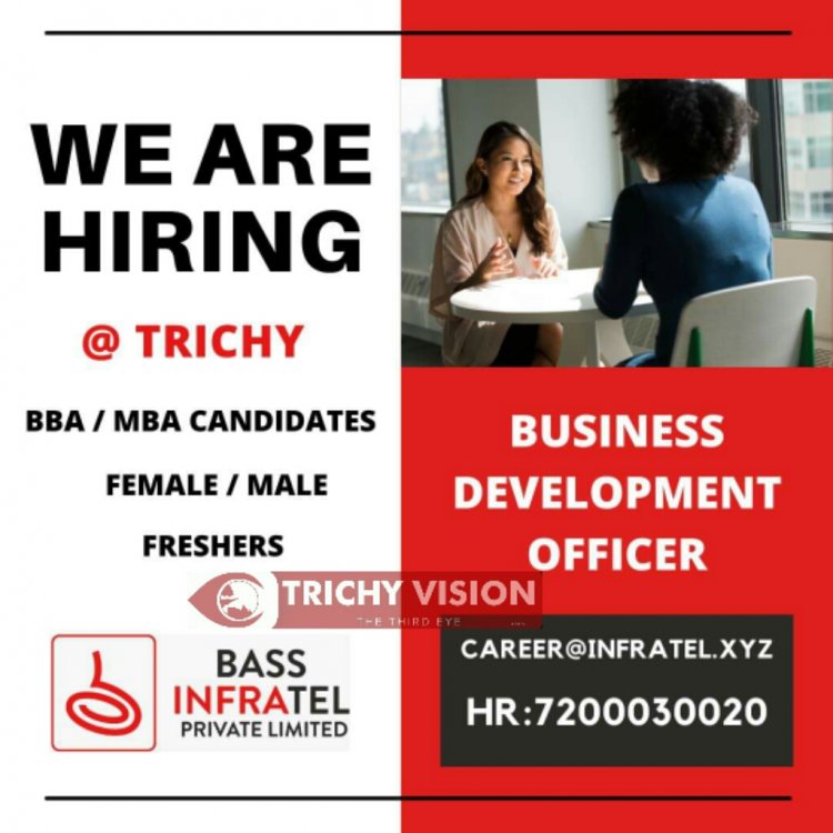 திருச்சி BASS INFRATEL நிறுவனத்தில் Business Development Officer பணியிடத்திற்கு ஆண், பெண் விண்ணப்பிக்கலாம். மேலும் தொடர்புக்கு கீழே உள்ள படத்தை பார்க்கவும்.