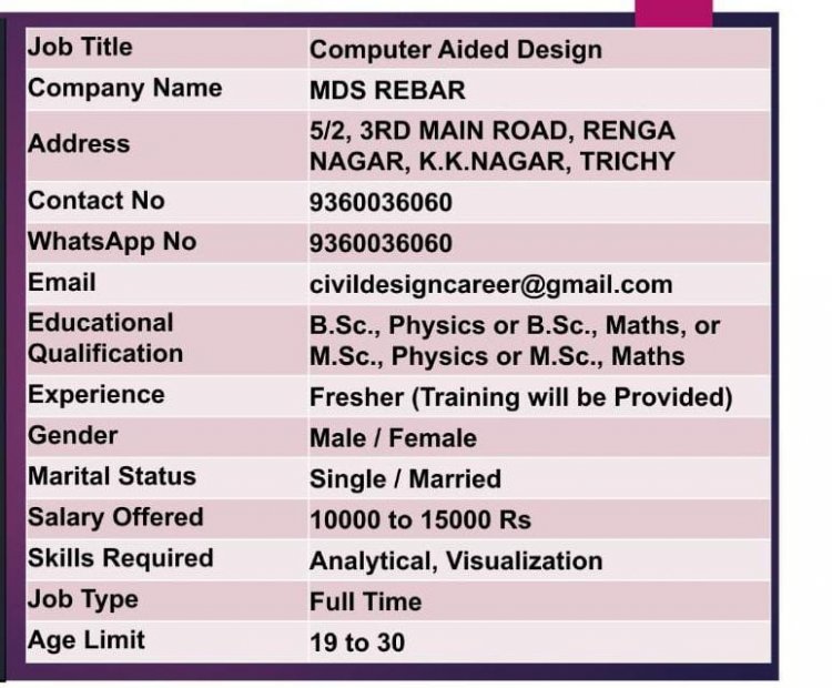திருச்சியில் செயல்பட்டு வரும் MDS REBAR நிறுவனத்தில் கீழ்கண்ட பணியிடங்களுக்கு வேலை வாய்ப்பு அறிவிக்கப்பட்டுள்ளது.
