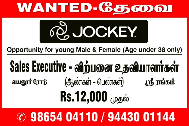 திருச்சியில் செயல்பட்டு வரும் ஜாக்கி நிறுவனத்தில் விற்பனை உதவியாளர் பணிக்கு ஆட்கள் தேவை மேலும் விவரங்களுக்கு கீழ் உள்ள படத்தை காணவும்