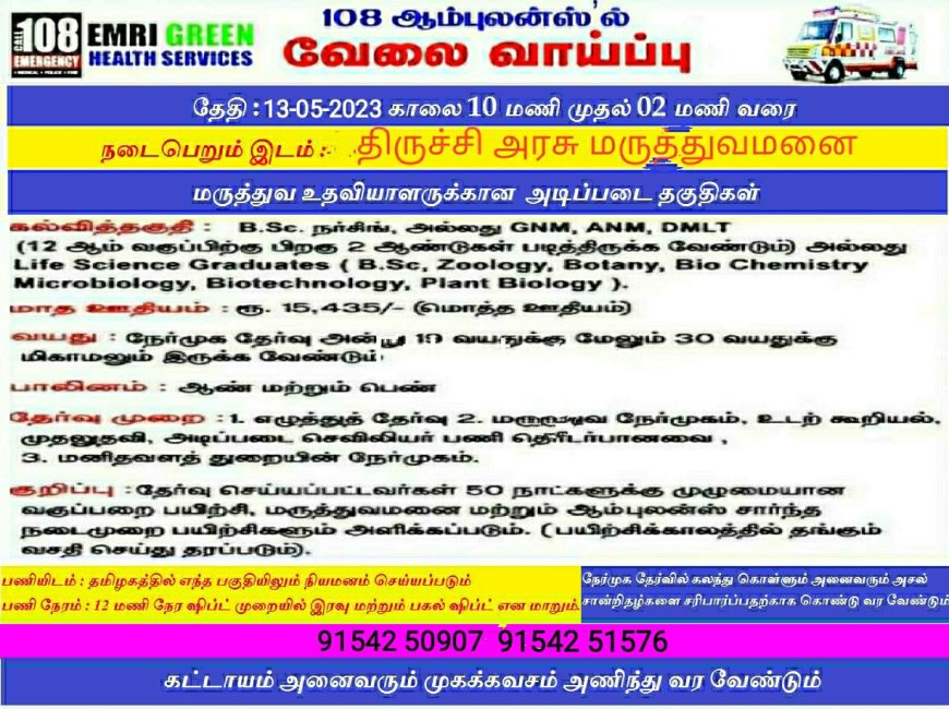 108 ஆம்புலன்ஸ்’ல் மருத்துவ உதவியாளருக்கான வேலை வாய்ப்பு முகாம் திருச்சி அரசு மருத்துவமனை வளாகத்தில் நாளை (13.05.2023) நடைபெற உள்ளது.