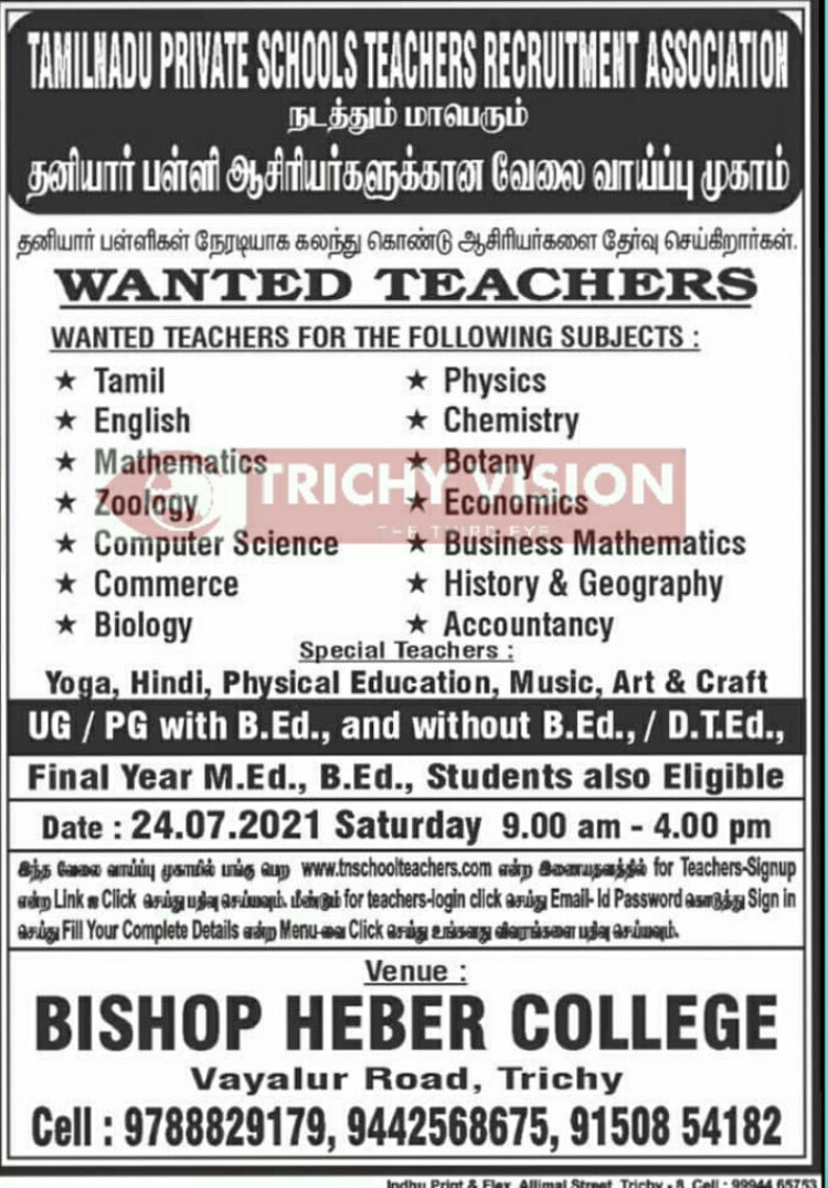 திருச்சியில் தனியார் பள்ளி ஆசிரியர்களுக்கான வேலை வாய்ப்பு முகாம்