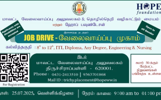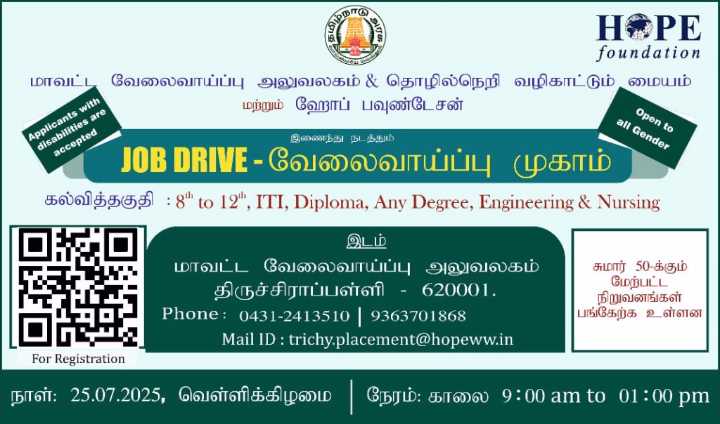 வருகின்ற 25/7/2025 அன்று காலை 10 மணியளவில் திருச்சி மாவட்ட வேலைவாய்ப்பு அலுவலகம் மற்றும் தொழில்நெறி வழிகாட்டு மையம் இவற்றுடன் ஹோப் பவுண்டேஷன் இணைந்து, வேலை வாய்ப்பு முகாமை நடத்தவிருக்கிறது.இந்த முகாமிற்கு 35க்கு மேற்பட்ட தொழில் நிறுவனங்கள் பங்கெடுத்து கொள்கின்றனர்.