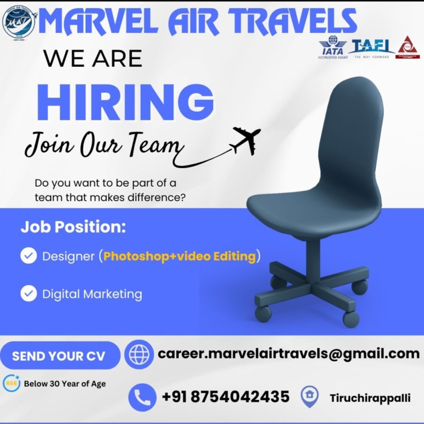 திருச்சியில் உள்ள மார்வெல் ஏர் டிராவல்ஸ் நிறுவனத்திற்கு டிஜிட்டல் மார்க்கெட்டிங் மற்றும் டிசைனர் வேலைக்கான ஆட்கள் தேவை.மேலும் விவரங்களுக்கு கீழே உள்ள படத்தை காணவும்.