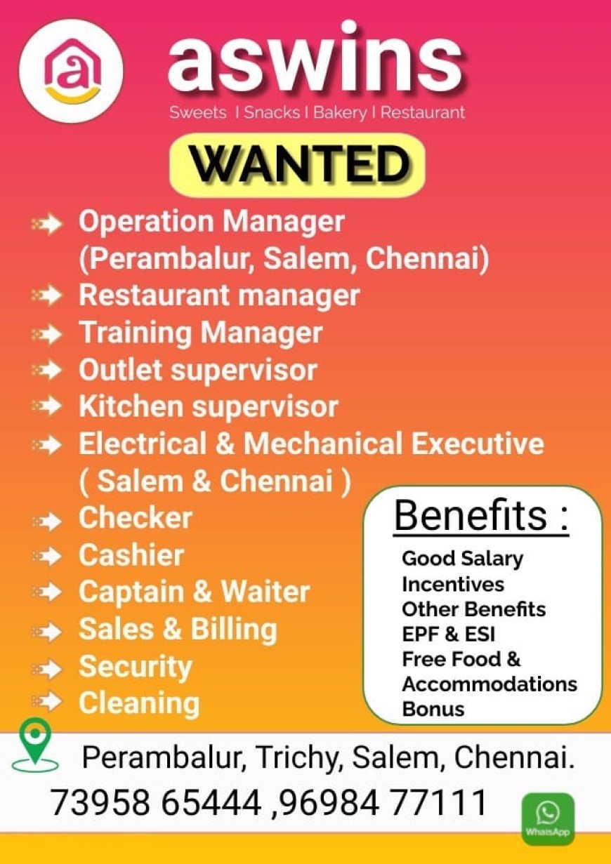 தமிழகத்தில் பிரபலமான அஸ்வின் நிறுவனத்தில் பல்வேறு பணியிடங்களுக்கான வேலை வாய்ப்புகள் அறிவிக்கப்பட்டுள்ளன.