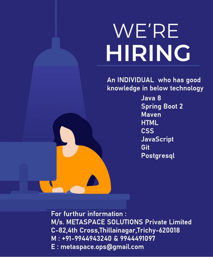 திருச்சி Metaspace solutions நிறுவனத்தில் வேலைவாய்ப்புகள் அறிவிக்கப்பட்டுள்ளன. மேலும், விவரங்களுக்கு கீழே உள்ள படத்தை காணவும்